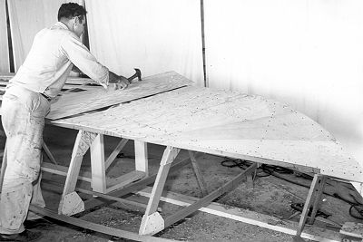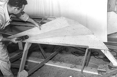 As the flatter areas of the hull are reached, less edge fitting is required and the size of the planking pieces can be increased as much as the form of the hull will allow. Notice that with this planking method, fastenings are driven into all hull members, even the athwarship frames. This differs from sheet plywood planking that is fastened only to longitudinals, stem, and transom. NEXT |