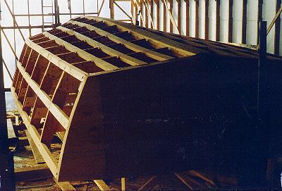 Building the Glen-L Yukonby Wayne MilnerPage 4 To construct the frames, I laid out the paper frame patterns and transferred critical corner points to the workshop floor, making an adjustment for the change in the keelson size. I cut out the frame material to fit the marks, cut the frame gussets, laid the parts together, drilled them, then glued and bolted everything together with epoxy and 3/8-inch galvanized bolts. The top ends of each frame were tied together with a 2x6 at a level 30 inches above the set-up line as specified in the instructions. After I got all that done, I found that I had inadvertently left the instructions for making the frames in the plans package. The only thing I hadn't done was to nail the frame material to the floor to keep it in place while it was being drilled. Not having done so wasn't a problem, as I stood on the frames while I was drilling them, and took care to keep them from moving. The next step was to erect the frames, transom, and stem assembly on the building form. These components on a boat this size are fairly heavy. I used a block and tackle hung from my roof structure. It is important to set the frames up in their proper locations, aligned longitudinally, plumbed, and well braced. I set up the transom first, and marked the frame locations on the building form. To increase the overall length of the boat, I increased the frame spacing by 10 percent. At this point, the shape of the hull was defined. It was only necessary to keep the frames, transom, and stem in their proper locations during the remaining part of the construction process to make the shape of the boat turn out right. I then made up the longitudinal members. The keel was installed by fastening it to the frames with epoxy and stainless-steel screws, one piece at a time until the three layers were installed. The keel was tapered into the stem, and the two were fastened together with epoxy and three 3/4-inch threaded rods. The sheer clamps, chine logs, and bottom and side battens for this boat are about 40 feet long. To assist in making up the 40-foot pieces, I fastened pieces of 2x4 lumber about a foot long to the vertical studs of my shelter so as to stick out horizontally about 3 feet above the ground. I laid out the pieces used to make the 40-foot longitudinals end to end on this makeshift workbench, and joined them together with 2-foot-long scarf joints. The scarfs were bolted through with three 5/16-inch galvanized bolts. I had used the same joint on a 24-foot boat I had previously built, and it had not come apart. Encouraged by this success I decided to do the same thing again. My longitudinals were made from 2x4 lumber in pieces from 10 to 16 feet long. I tried to stagger the joints in adjacent stringers as much as possible. Notching the frames to receive the chine and shear longitudinals and the intermediate battens is fairly easy to do along the straight parts of the hull. I did this by laying the longitudinal up against the frames, and marking each one for the width of the notch by marking along the longitudinal, then setting the saw depth of cut to the thickness of the longitudinal, making several saw cuts where the notch is supposed to be, and chiseling out the wood. When this is done by an amateur, no matter how carefully you mark and cut, you will invariably end up with a notch that is too big or too small. If it is too small, cut a little more out. It will then invariably be too big. Fill the space with shims and epoxy. Trying to notch the frames in the bow section with any degree of accuracy is difficult. Once the notches were made, it was time to fasten the longitudinals to the frames, the transom, and the stem. The literature I have read on the subject says that you should start by fastening the sheer and chine longitudinals to the stem and then bend them in to meet the other frames and the transom. I didn't do it that way, mainly because I thought my shelter wasn't wide enough to accommodate the unfastened ends. I fastened the longitudinals to the transom first, then bent them in to fit the frames. This worked really well, until I got up to the bow section. The sheer and chine longitudinals had to be pulled in a long way to fit against the stem. A Spanish windlass came in handy. I wrapped a piece of rope around the chine logs a little way back from where I thought the ends would be, tied the ends of the rope together, put a twist stick between the ropes, and twisted.