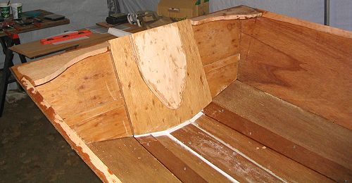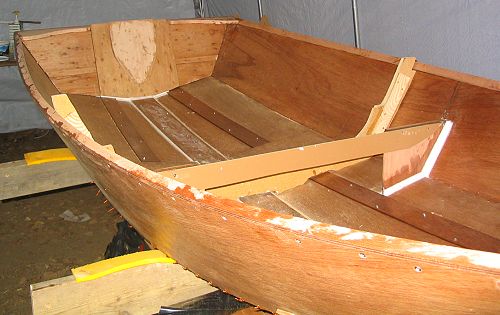 I can cause myself more problems…when I was cutting out the breast hook I cut the final shape so did not leave myself the clamping pad to clamp the shear. Yes I do know that instruction is printed on the template sheet – just a little aggressive when I was cutting it out. I glued the plywood layer onto the back of the breasthook and glued the piece I had cut out of the breasthook back in. I don't throw much out on a project until I'm done so I still had the piece! Once dry I cut the clamp pads to shape. When all is done I'll follow the glue line and take them back out. I cut the angles on the breasthook, adjusted the fit with a belt sander and installed it into the hull with stainless steel screws and epoxy. I'm using stainless for all the screws I had Noah's here in Toronto rip the inner and out sheers for me. The inner shear was fitted into the slot in the breasthook after being coated in epoxy and clamped in place. I enlisted my wife to assist with holding and clamping as the shear was bent down, clamped and screwed to the planking. I was worried about it breaking but the mahogany bent to the curve quite nicely and there did not seem to be any danger of it breaking. The second side was installed just as easily. I was worried about this task but it went very smoothly.