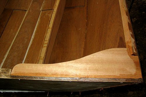 The next task was to fabricate the corner knees for the transom. The first one too me about three hours to make after transferring all the angles from the boat itself with an adjustable T-square. I manage to ruin it with about 30 seconds too much belt sanding on one edge. The second one only took about an hour to make. Yes I know I'm slow. I had to keep second guessing my self on the one for the port side as the angles are opposite. In the end I'm quite pleased with the way both of them fit. Not perfect but acceptable. Installed with stainless screws and epoxy.