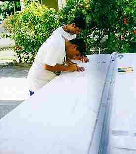 They do not currently have a brochure, but sent these drawings. Poxy-Shield: When to encapsulateIf you intend to encapsulate your boat with epoxy, when should you encapsulate? It is most often recommended that you encapsulate frames before planking so that the bottoms and edges can be coated while they are still accessible. Because interrupting the building process to coat slows momentum and seems more time consuming, many builders coat the rest of the inside of the hull after planking, and the hull is right-side up. This may, however, not be as time saving or as easy as it seems. Any epoxy coated surfaces that will be exposed to sunlight must be painted or varnished. In order to paint, you must first clean off the amine blush and then sand thoroughly. This can be a knuckle busting experience when you have to sand around frames and longitudinals. A better way is to coat frames with two or three coats of epoxy and sand on a table or other flat surface prior to putting them on the building form. After the planking is fitted, but before it is installed, coat with two to three coats and sand on a flat surface. Sanding is quicker and easier than sanding after assembly. Epoxy sticks well to epoxy as long as the amine blush is removed and the surface is sanded. As stated elsewhere on this site, encapsulation is an optional procedure and is not required. Encapsulation is done primarily to protect the wood. Any holes made in the epoxy surface should be sealed to prevent access by water. Plywood & Lumber SuppliersOne of our most FAQ's concerns finding sources for lumber and plywood. WE NEED YOUR HELP. In the "Useful information and Sources" pages we have a "List of Lumber Suppliers" which contains suppliers, listed by state. Many of these entries are more than 10 years old; I suspect that some are no longer valid, or that the phone numbers have changed. If you notice any mistakes or have a local supplier who is not on the list, I would appreciate your input. To my knowledge there is no similar list anywhere else on the web. Help other builders and future builders by submitting to this boatbuilding resource. Send: Company Name, Address, phone number, and type of product (L=boatbuilding lumber, PW=marine and AB exterior plywood, Okoume=4 or 5mm marine plywood, V=cold molding veneers, not decorative veneers). Send any corrections or new sources here. Feedback: Sea KayakDear Sir: We bought your plans and built the 17' ocean going kayak. I'm sending you a few pictures of our project. For your information, we never built any type of marine craft before, we never used fiberglass or epoxy, and certainly never heard of the "stitch and glue" process. Your plans were easy to follow and made this project lots of family fun. I've numbered the pictures and offer the following very brief notes.