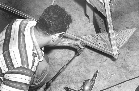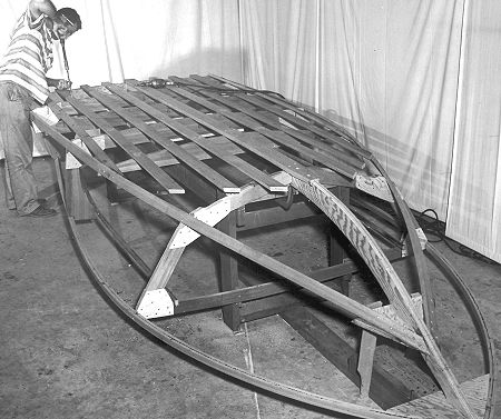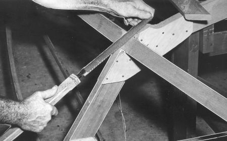 Fig 14: The builder is filing a notch in the chine to conform to the contour of the bottom frame. This is done along the chine, sheer and keel at each frame.