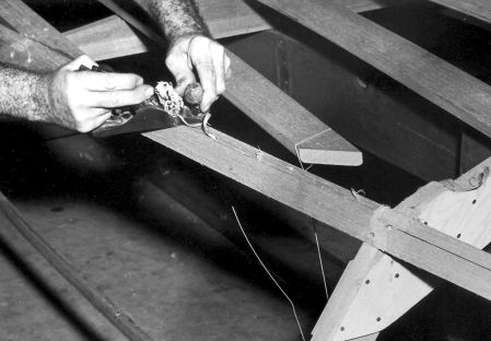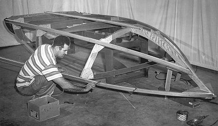 Fig 12: The sheer is put on in two laminations, with layers liberally coated with glue. The sheer is set in vertically from the stem to Frame 5.
