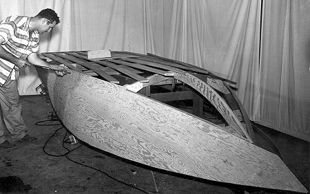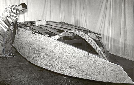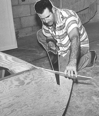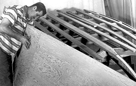 Fig 21: Fitting the panel is easy. The panel is leaned against the side of the hull and contour is marked to the panel, using the framework as the pattern. Note: The panels shown in these photos are full-length. Today, we would use 4' x 8' standard sheets and join with a butt block or scarf-joint. These joints would be made between frames (not on frames), preferably where there is the least curvature. We usually use a butt block.