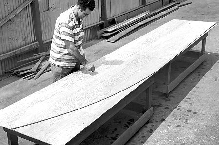Fig 23: After fitting the first side panel, it is checked to the opposite side, then traced onto the second side to simplify fitting. Take care to insure that the best face will be on the outside of the hull.