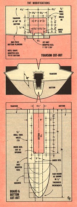 Jacuzzi engineers, incidentally, caution against the indiscriminate placing of this power unit in just any hull. The TNT was chosen because its particular bottom design is ideally suited for jet operation. A flat bottom, for instance, would cause the jet intake to suck in more air than water and performance would be killed. Mini-Jet handles well. She can turn almost inside her own length and operates in satisfactory fashion in reverse. The frame kit and plans set from Glen L were a big help in putting this tiny bombshell together. The transom, assembled and gusseted frames, breasthook, stem and transom knee come ready to be used. The kit, complete with plans, step-by-step instructions and a materials list, costs $58 from Glen L Marine Designs, 9152 E. Rosecrans, Bellflower, Calif. Fastening kits, in either galvanized or bronze, are available for $15 and $35, respectively. The galvanized kit was used with the MI boat since it will be run only in fresh water. Additional materials, including plywood for the bottom, sides and deck, and paints ran about $75. The modifications shown in the accompanying illustration are relatively minor to make but are vitally important to installation of the power package and performance. The dropped keel, in particular, should be strictly adhered to.