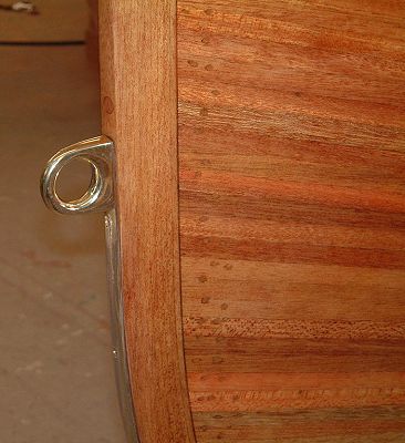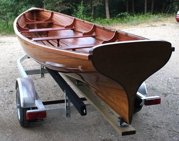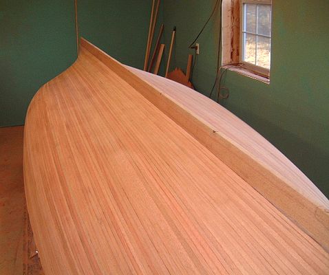 sanding. Started with The hull is covered with 6 oz. cloth and 4 coats of epoxy. The original plan by me was to do the transom first (I did). Then with one piece of 50" cloth, do half the hull, P or S, wrapping over the keel as far as it would reach. Then repeat this on the other half. In practice that was a mistake. The height and taper of the keel made it nearly impossible to squeegee the cloth down towards the sheer without pulling it away from the keel. I ended up getting the hull perfect and cutting away the portion that wrapped the keel. Did both P & S this way, then I did the keel with 12" lapping this piece on to the hull bottom equally. I probably spent a week hand sanding the epoxy to 120 grit. The varnish work took the longest of any part of the boat. Ten coats inside and out, sanding between coats with 320 grit sandpaper. After flipping the boat from the mold form onto a cradle, the whole sanding process was repeated. Probably 100 nail tips to cut off from plank edge nailing. After sanding to 120 grit, hull interior was sealed with 2 coats of epoxy. Fillets were done next with epoxy and wood flour. Templates were made next for transom quarter knees, breasthook, and thwart brackets. Because I routinely do curved laminated millwork, I decide to do these parts that way. Male/female molds were made to glue up laminated blanks in a size to cover each of those 3 parts. The knees and breasthook took 56 plies to get 5 1/4" wide blanks, probably could have physically bent thicker plies, but a blank that size is a handfull. All these parts were made of Jatoba. The thwarts were as well. Hand rubbed final coat of varnish on all the Jatoba parts, and a matte finish final 2 coats on the hull interior finished the boat itself. I added a few small cleats in polished bronze, cast bronze oarlocks, and 8' oars from Glen-L. I have drawings for hand made spoon blade oars and may switch to them as time allows.