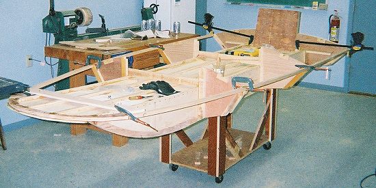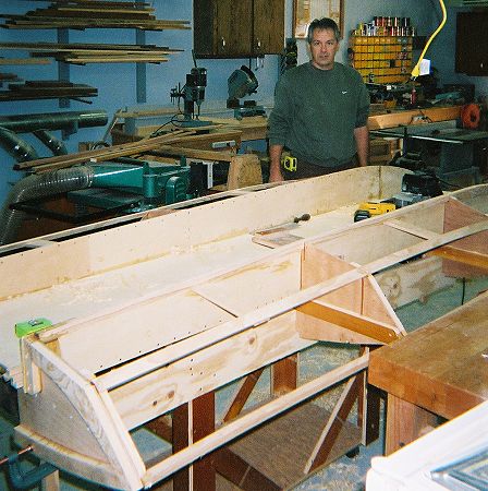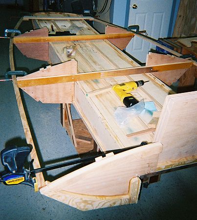 The first couple of pics are the Tunnel Mite during the frame construction and assembly on the building jig. I had lots of help from my brother; without him, the bending of the sheers and chines would not have happened. I soaked them in the swimming pool for a day before trying to bend them. Wait until the frames are made and assembled on the jig before cutting the chine and sheer notches in frame 2; reason being that the angle and curvature cannot be guessed upon and cut. (lesson #1) I used Glen L fasteners, epoxy, 'glass and filler materials throughout and highly advise others to do so.