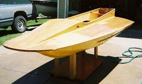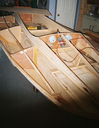 Bottom and side planking installed. By this point, you should have planned for all the necessary electrical, fuel, gauges, wiring, etc to fit through the available spaces; it's very difficult, if not impossible after. Starting to look like a boat! This shot shows that I raised the dash height by 3 inches; it just seemed to fit and look better that way. I had read in the photo archives where others had also done this on other designs without complications. Also note that I did not encapsulate the planking and frame members during the process; big mistake; it's MUCH easier during the constructing than after, there are just too many nooks and crannies to get at; you'll miss many.