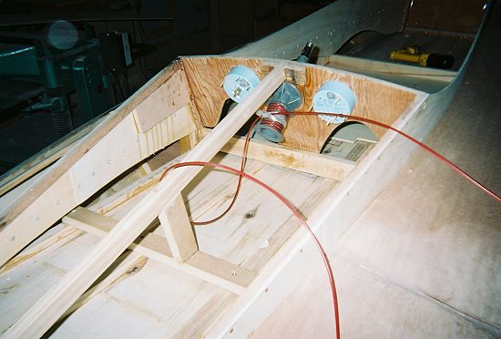 Pour-in floatation and top sheathing installed. I found the sheathing process something to take your time at to get the pieces to fit along the coaming correctly. I used the back side of a plastic spoon and Poxy-Shield thickened with microballons to get a nice looking radius along the coaming/side decking joint. Also, make absolutely sure to properly countersink all nail and screw heads at this time, it's easier to fill the dimples with thickened epoxy than to try and grind off the heads and hope they don't show. (Trust me on this one…) Here I installed blocking for the coaming pulleys and additional bracing for the strongback. The gauges and steering are fitted. I decided to stay with the exposed cable steering system as it's what's specified in the Glen L plans, and, I salvaged it from an abandoned boat that washed up on the beach here on the Mississippi River.