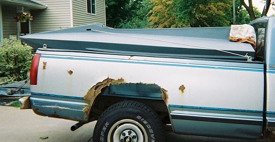 Fiberglass installed, sanded and working on the wet sanding. I would recommend that you purchase a good rubber sanding block and 3M wet/dry paper for this part. (lesson #2) I was a little nervous about laying down the 'glass at first but after reading Glen L's book, "How To Fiberglass Boats", it made much more sense and went easy.