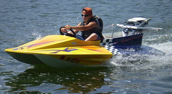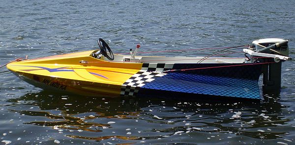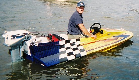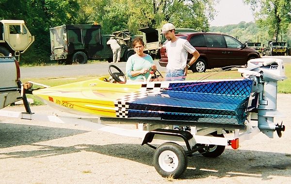 Here's my nephew "burning up fuel". He loves it, hard to get him out of it! While I installed a stock OMC 15 HP, it deserves a 20-25 HP; performance as-is was close to 25mph with the nephew at the controls.