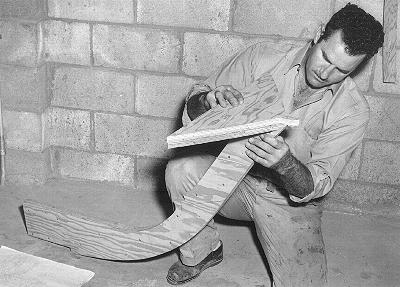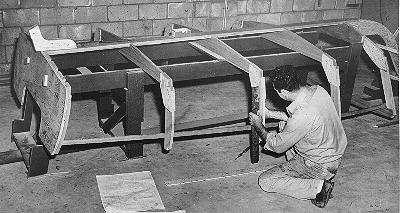 Fig. 3 - The frames are mounted on the building form that is leveled both athwartship and lengthwise. A level is then used to plumb each frame. When the frames are aligned, each frame is braced to the building form and/or to one another to prevent movement. |