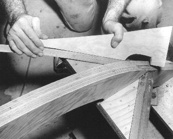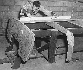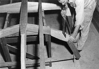Fig. 5 - The notches for the chines will be angled at each frame as needed to insure that the chine will mate firmly with the frame. Here Don is cutting the required bevel in Frame #4.