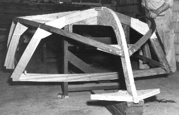 Fig. 4 - The transom is mounted on the building form so that the keel and bottom battens are straight lines in the aft section. It is imperative that these members not have humps or hooks as this can have undesirable affects on performance. These members should be checked periodically to insure that they remain straight.