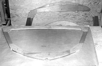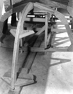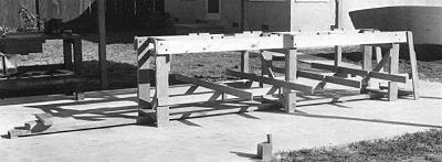 3. The frames are located on the building form and blocked in place. The breasthook (triangular shaped piece) is fastened to the stem and the stem to the first frame. This assembly is mounted as a unit, with blocking to bring the breasthook up to the level specified in the plans. Notice the 1" x 4" cross members to which the frames are attached. All framing members should be blocked and braced enough to insure that these members do not move during construction. Extra time spent setting up can save a great deal of work farther on in the construction process. |